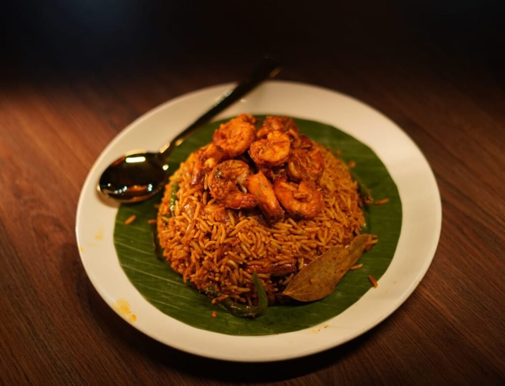 A royal Bengali platter inspired by the rich culinary heritage of Barisal, featuring aromatic ghee-infused Chingri Polao cooked with premium prawns and fragrant basmati rice